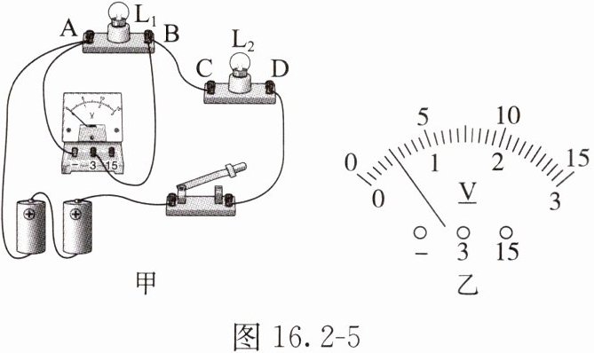 聪聪在探究串联电路中用电器两端的电压与电源两端的电压的关系的实验中,连接了如图16.2 - 5甲所示的电路,电源为两节新干电池。