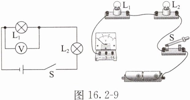 1. 根据图16.2 - 9中的电路图,用笔画线表示导线将实物电路补充完整(电源为两节新干电池)。
