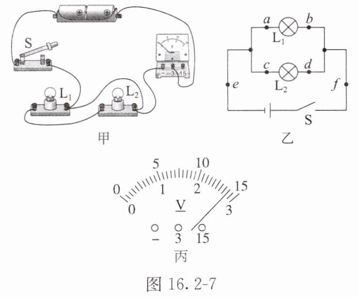 (2)如图16.2 - 7乙所示电路,将电压表正确接在a、b两点,闭合开关S后,电压表的示数如图16.2 - 7丙所示,则电压表的示数为