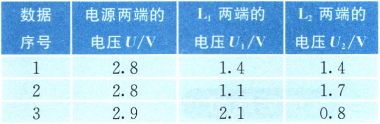 (3)由题表中数据可得:在串联电路中,电源两端的电压等于两个小灯泡两端的电压之和。在串联电路中,电压的规律是U=U₁+U₂。