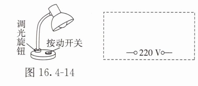 6. 一个可调亮度的台灯如图16.4 - 14所示,台灯的面板上有一个按动开关,负责电路的通断;还有一个调光旋钮(相当于一个滑动变阻器),旋动旋钮可以改变灯泡的亮度。请你在虚线框内画出这个台灯的电路图。