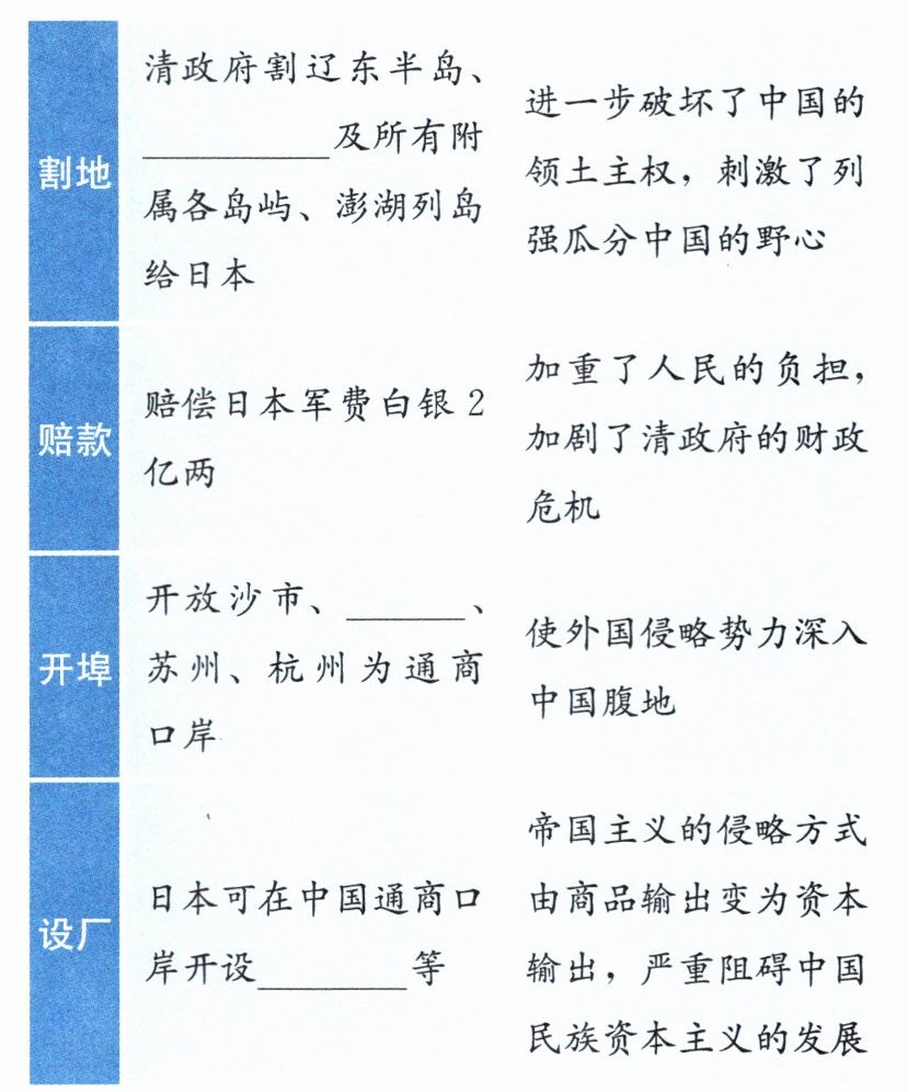 (2)影响:使中国的领土主权遭到严重破坏。巨额赔款迫使清政府大举外债,从而遭到列强进一步控制。外国侵略势力深入中国腹地,通过投资办厂加紧对华