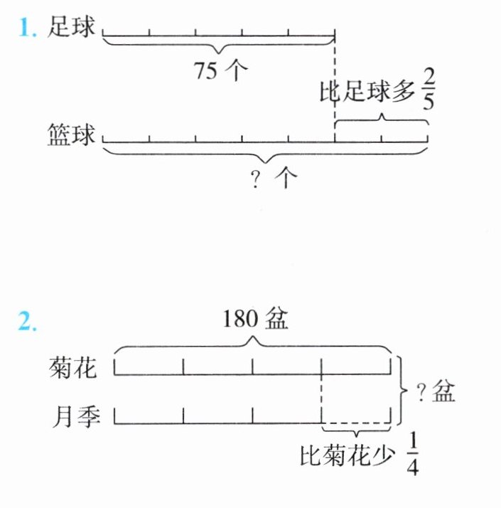 1. $75×(1+\frac{2}{5})=105$(个);2. $180-180×\frac{1}{4}+180=315$(盆)
