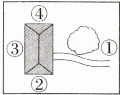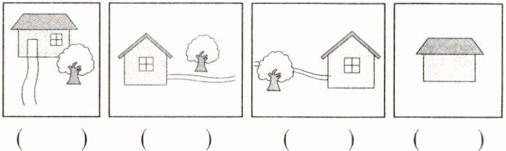 6. 右图是从空中看到的明明的家。下面四个画面,分别是站在①②③④哪个位置看到的?请把位置序号填在括号里。