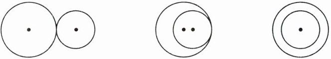 1. 两个大小不同的圆组成下面三个图形,请画出每个图形的对称轴,并说一说它们的对称轴有什么共同的特点。