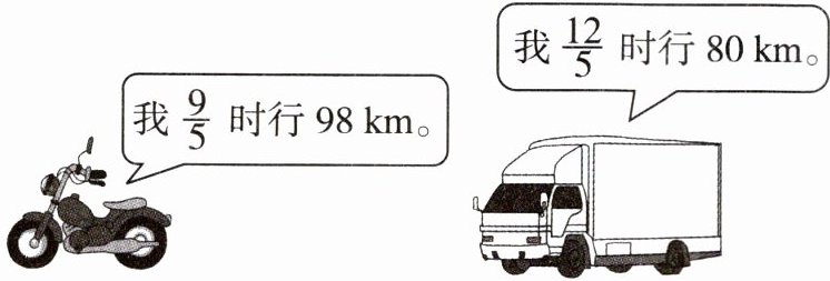 (3) 速度=路程÷时间,摩托车速度为$98÷\frac{9}{5}=98×\frac{5}{9}=\frac{490}{9}$(km/时),货车速度为$80÷\frac{12}{5}=80×\frac{5}{12}=\frac{100}{3}$(km/时),速度比为$\frac{490}{9}:\frac{100}{3}=\frac{490}{9}:\frac{300}{9}=490:300=49:30$。