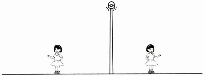 在图中灯杆右侧小女孩的左侧(靠近灯杆一侧)画一条短斜线表示影子,长度约到小女孩脚部水平位置稍向左延伸;在灯杆左侧小女孩的右侧(靠近灯杆一侧)画一条短斜线表示影子,长度约到小女孩脚部水平位置稍向右延伸。