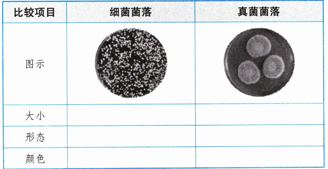 (2) |比较项目|细菌菌落|真菌菌落| |大小|小|大| |形态|或光滑黏稠,或粗糙干燥|霉菌呈绒毛状、絮状或蜘蛛网状| |颜色|白、黄、红等|白、红、褐、绿、黑、黄等|