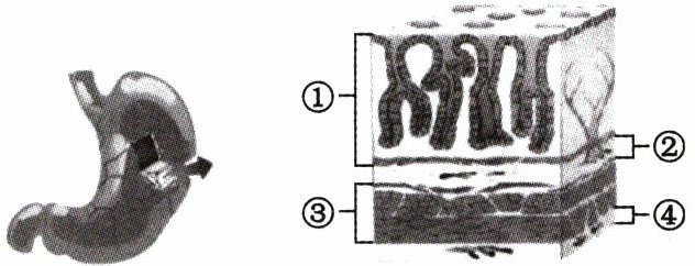 辣椒中富含强烈刺激性的辣椒素,长期或大量摄入辣椒,会增加胃受损的风险。人的胃壁有四层结构,分别是①胃壁黏膜层、②胃壁黏膜下层、③胃壁肌肉层、④胃壁浆膜层(如图)。阅读材料完成9、10小题: