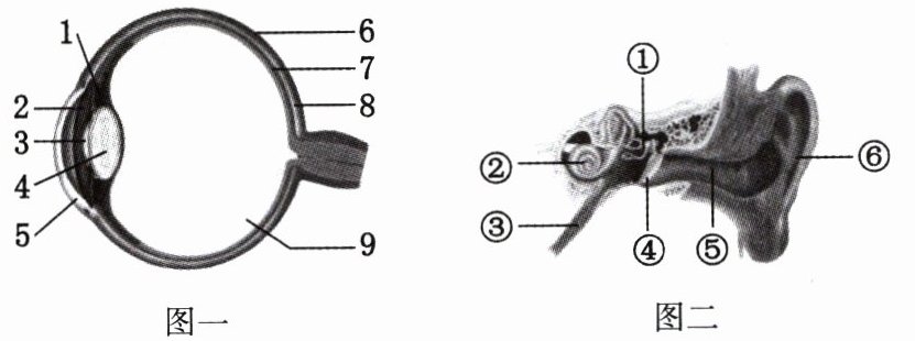 (1) 从室外刚走进较暗的室内时,小尧“两眼发黑”,这是因为此时图一中他的[ ]____较小,透过的光量____,于是他用手摸索着扶住了墙,此时对墙的感知主要靠____觉。