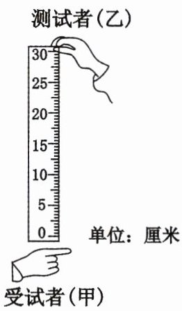 测试者(乙)手持尺子顶端,使尺子竖直悬空,并让刻度值为 0 的一端与受试者手指对齐。