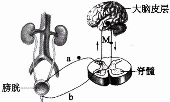 思路解析:排尿反射的神经中枢位于脊髓,故排尿反射属于非条件反射,A 正确。人体大脑皮层中具有调控感觉的神经中枢,故尿意是在人体的大脑皮层产生的,B 正确。若 M 处受损阻断,由于排尿反射的反射弧完整,因此人体仍能排尿,且脊髓到大脑皮层的神经通路也没有受损,故而也能产生尿意。但 M 处的神经受损,因此大脑皮层不能再控制排尿反射,C 错误。由图可知,a 上有神经节,因此 a 是传入神经,能将神经冲动传到神经中枢,则 b 是传出神经,能将来自神经中枢的神经冲动传到效应器,D 正确。故选 C。