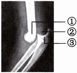 7. 小尧在体育运动中用力过猛导致肘部关节脱位。如图为他在医院检查时肘关节的X射线透视图像,①②③表示肘关节内的结构。下列说法不正确的是( )