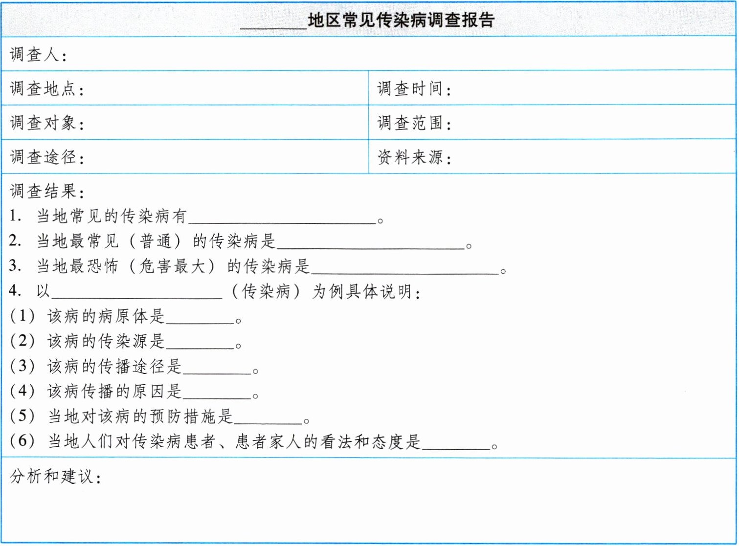 (2)通过调查,了解当地常见传染病的种类、致病原因、流行情况和预防措施。