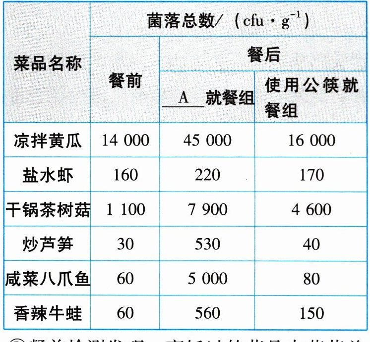 ③A就餐组的每道菜品中菌落总数均高于使用公筷就餐组,原因是不同菜品中的细菌通过筷子交叉污染,以及_________中的细菌通过筷子传到菜品中。
