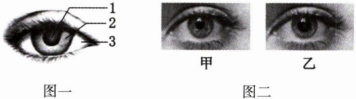 D.若人眼的瞳孔状态由图二中的乙变化到甲,说明周围环境的光线在增强