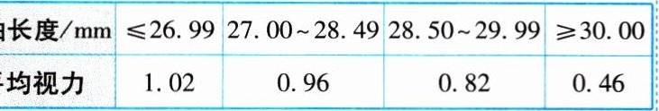| 眼轴长度/mm | ≤26.99 | 27.00~28.49 | 28.50~29.99 | ≥30.00 |