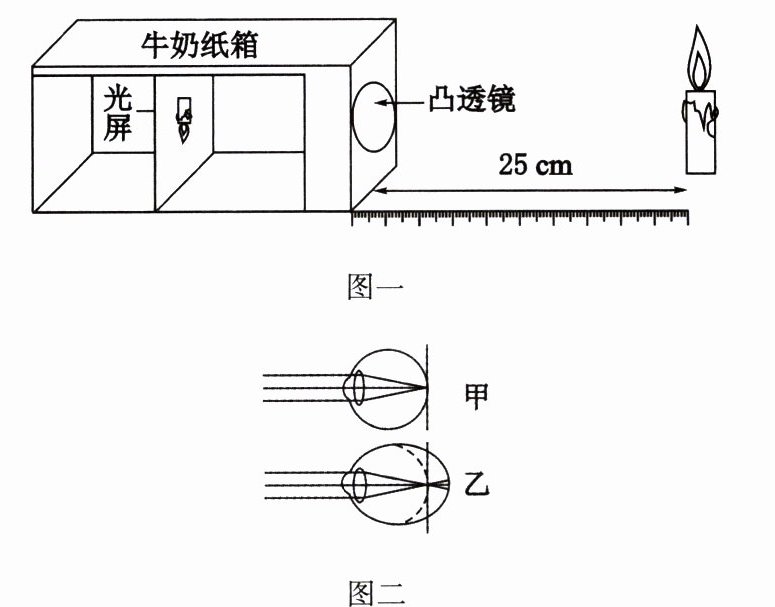 12. 某校生物学兴趣小组的同学用牛奶纸箱、凸透镜和蜡烛等,制作了一个模拟人的眼球成像过程的简易模型(如图一)。在距牛奶纸箱右侧25 cm处点燃一根蜡烛,可以观察到光屏上出现了一个清晰、倒立、缩小的物像。图二是人正常与患近视时的眼球结构及成像情况。请分析回答下列问题。