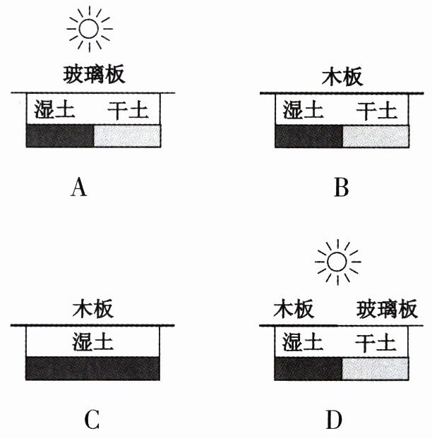 9. 某同学了解了鼠妇喜欢阴暗的环境后,准备继续探究“水对鼠妇分布的影响”,他应该选择下列装置中的 ( )