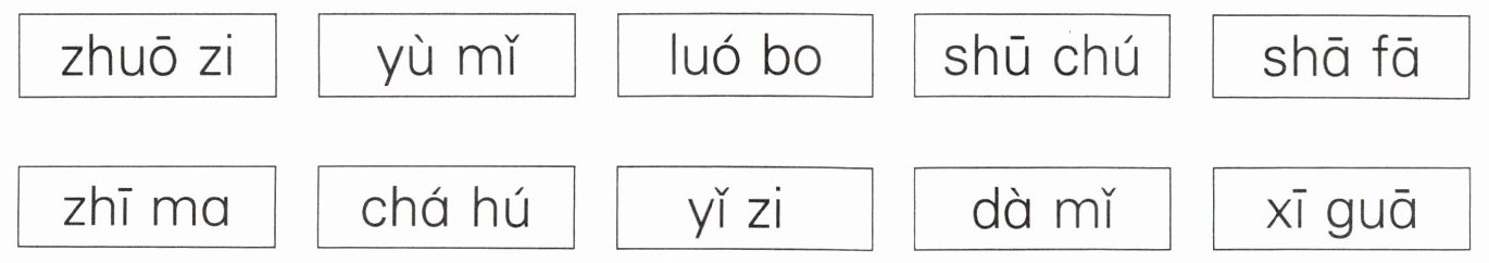 食物类(涂相同颜色):yù mǐ、luó bo、zhī ma、dà mǐ、xī guā