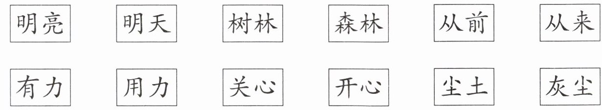 本题要求给读得正确的词语涂上颜色,经辨别,这些词语读音均正确,所以将所有词语涂上颜色(因无法真正涂色,以文字说明涂色范围)。即“明亮”“明天”“树林”“森林”“从前”“从来”“有力”“用力”“关心”“开心”“尘土”“灰尘”这些词语都应涂色。
