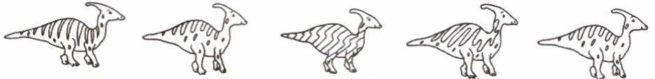 (2)从左边数,第( )只恐龙玩具和第( )只恐龙玩具完全相同。