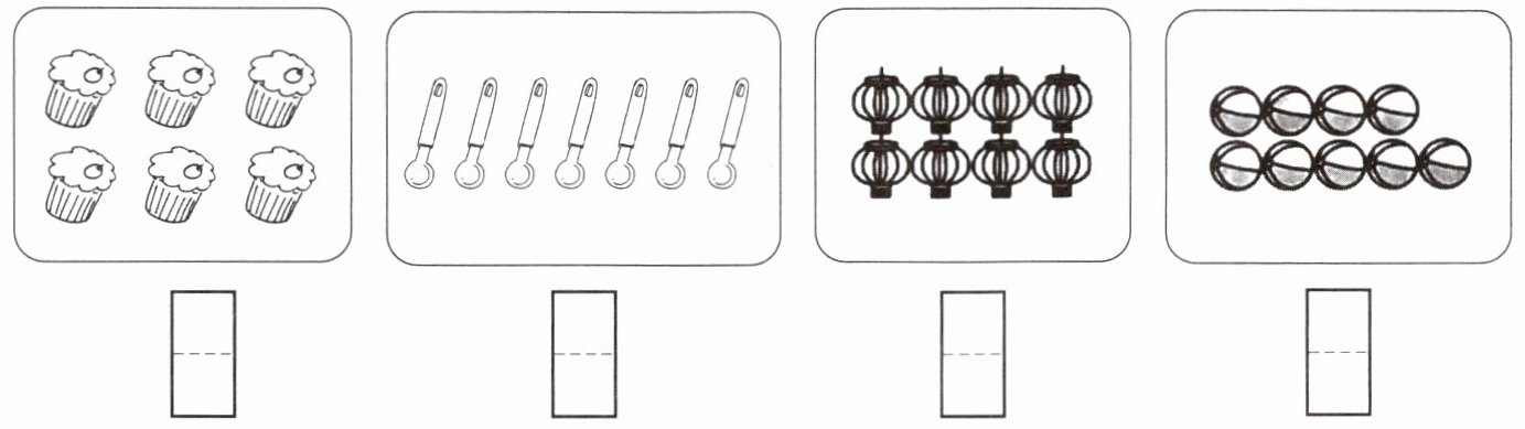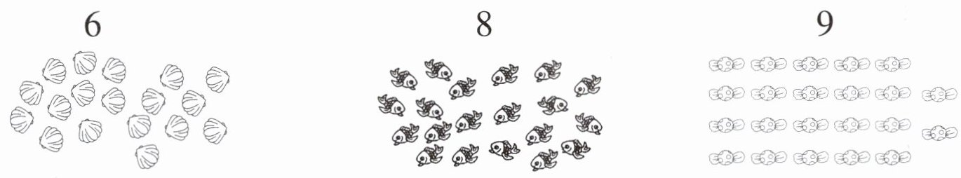 (由于无法直接在文本中圈出图片内容,此处应根据实际插图中物品数量,分别圈出与数字6、8、9对应的6个贝壳、8条鱼、9条鱼。)
