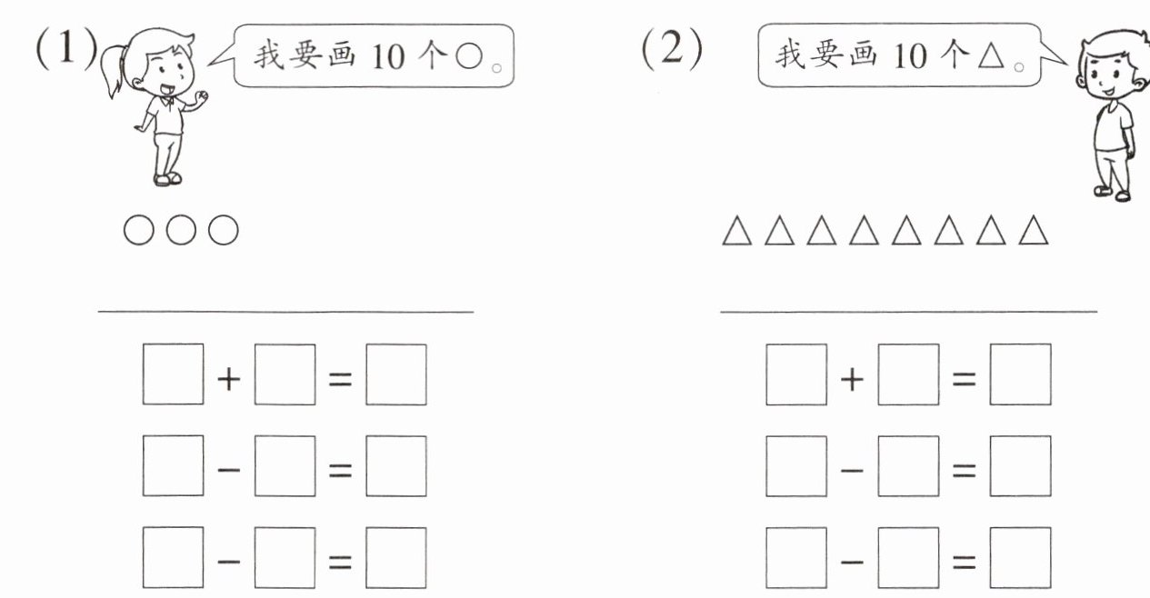 $4 + (\quad) = 10$ $(\quad) + 5 = 9$ $2 + (\quad) = 10$ $10 - (\quad) = 3$