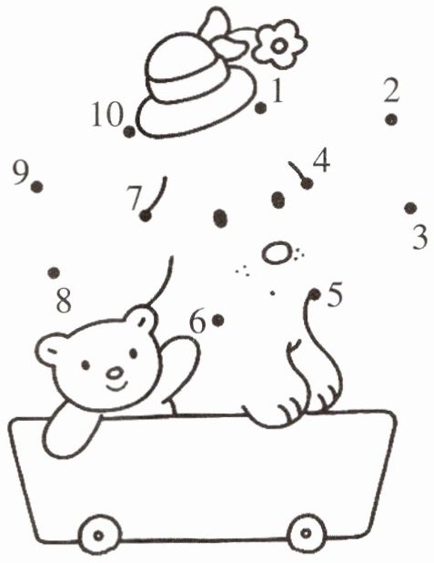 答题:按1~10的顺序连线的路径为从数字1(帽子顶部)开始,依次连接数字2到10,形成完整图案(帽子-飘落点-小熊和小狗在船中图形)。