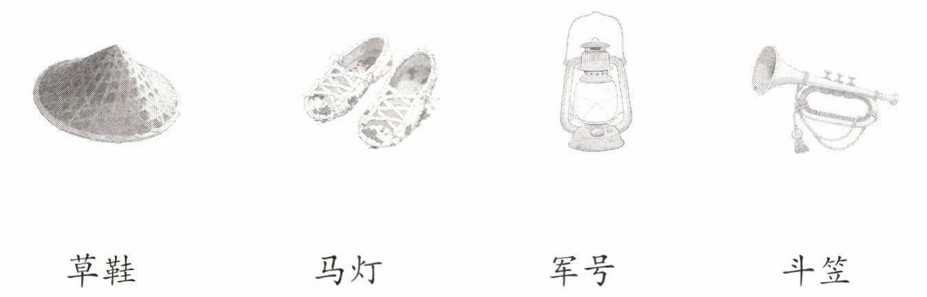 第一个图连斗笠,第二个图连草鞋,第三个图连马灯,第四个图连军号。