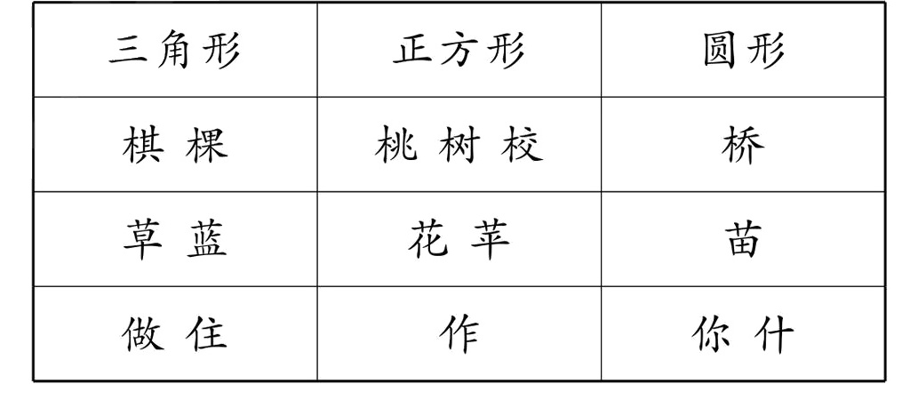 (1)请你帮他们将文字卡片按形状分类,再把结果记录在下表中。