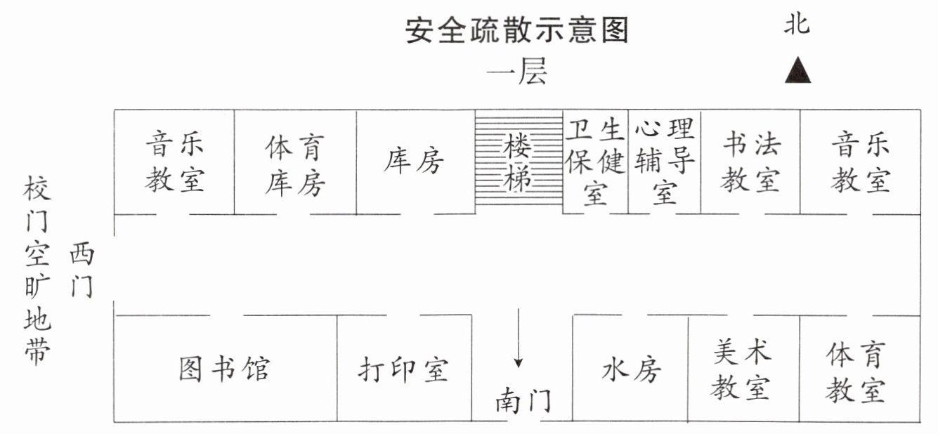 3 如果你在书法教室上课,请设计一条到南门的安全疏散路线。