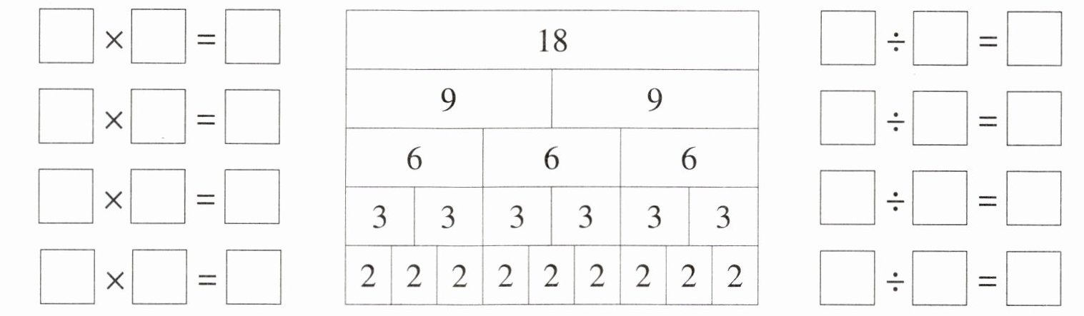 9×2=18 6×3=18 3×6=18 2×9=18 18÷2=9 18÷3=6 18÷6=3 18÷9=2(答案顺序可以不一样)