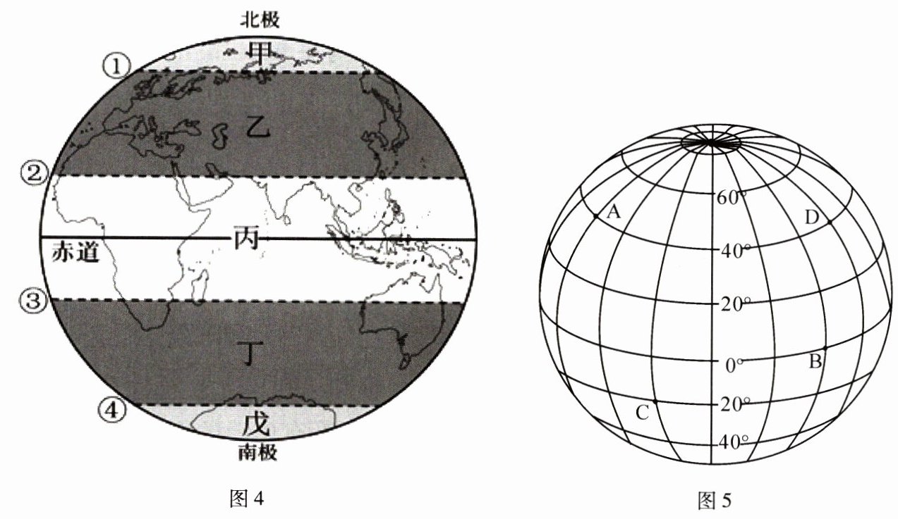 低纬度:______ 丁所在半球:______戊所在的高中低纬度:______