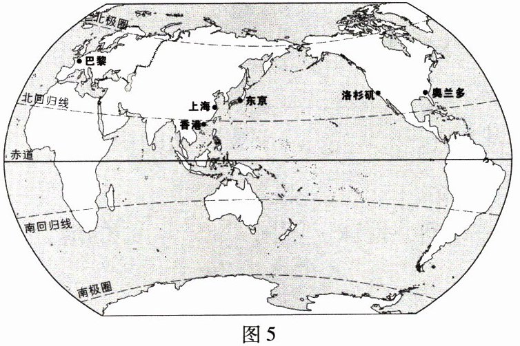图5为全球6个迪士尼乐园所在城市分布图。读图回答3、4题。