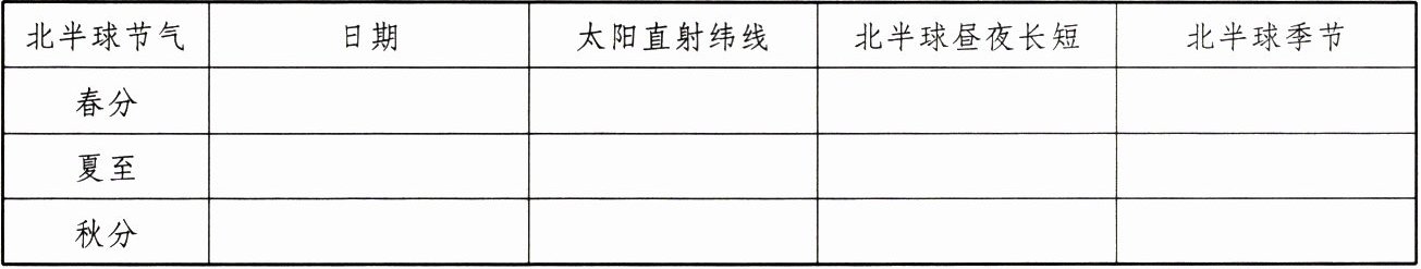 北半球节气 日期 太阳直射纬线 北半球昼夜长短 北半球季节 春分 3月21日前后 赤道 昼夜等长 春季 夏至 6月21日前后 北回归线 昼长夜短 夏季 秋分 9月23日前后 赤道 昼夜等长 秋季