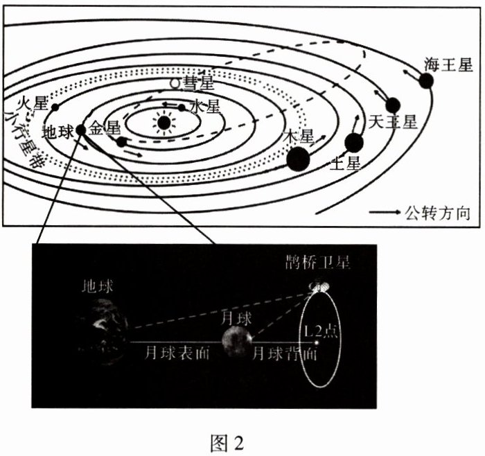 月球是国际宇航界深空探测领域的第一站,为了能够接收从月球背面发射的信号,我国在月球背面和地球之间搭建了一个“信号中转站”——“鹊桥二号”。读“鹊桥二号”位置示意图,据此完成 1~3 题。