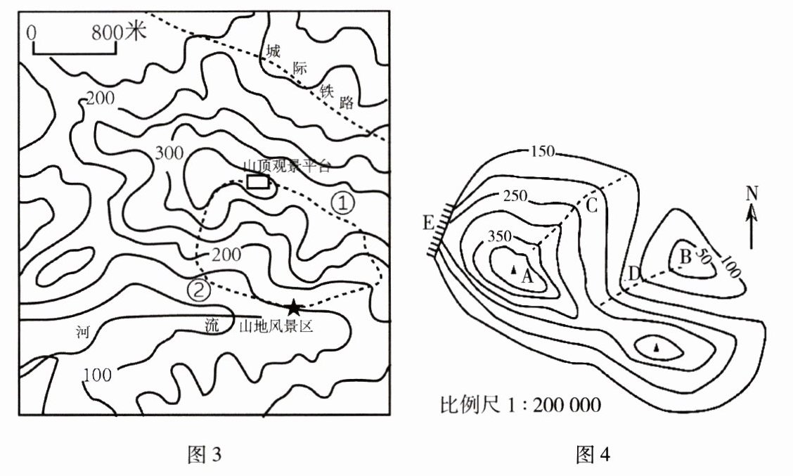 1.图4为某地等高线地形图(单位:米),读图完成下列各题。