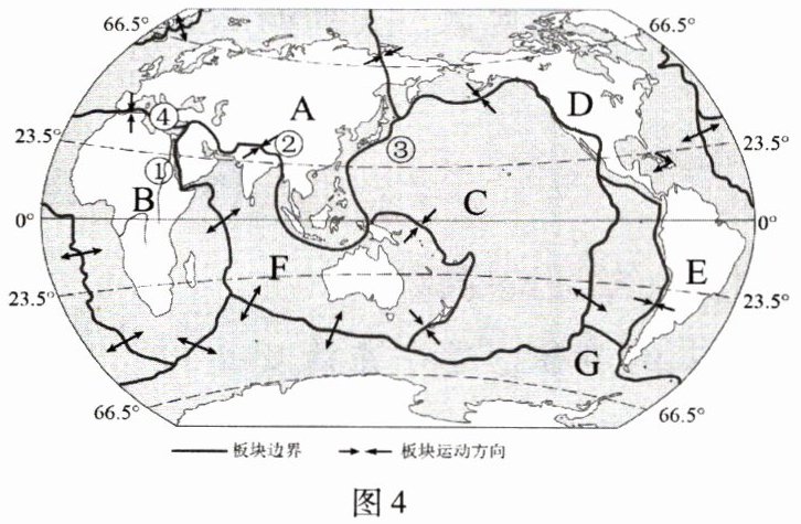 伸”)运动,图4中几乎都是海洋的板块是______(填字母)。