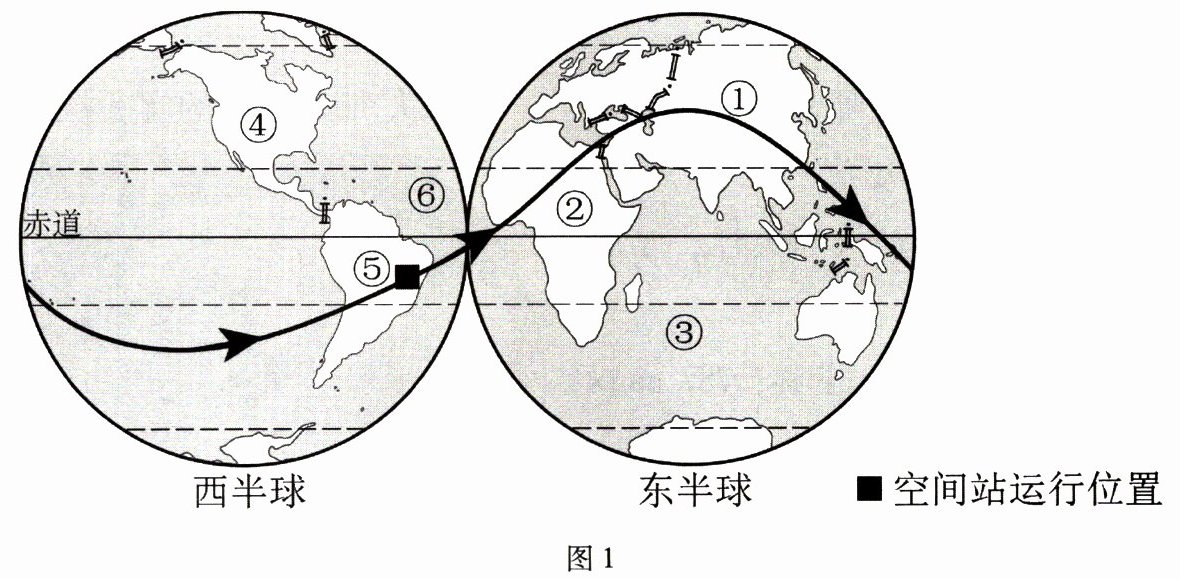 天宫空间站是我国自主研发的距地$400~500$千米绕地飞行的空间站系统。图 1 为天宫空间站某时刻运行位置和轨迹图。读图完成$1~3$题。