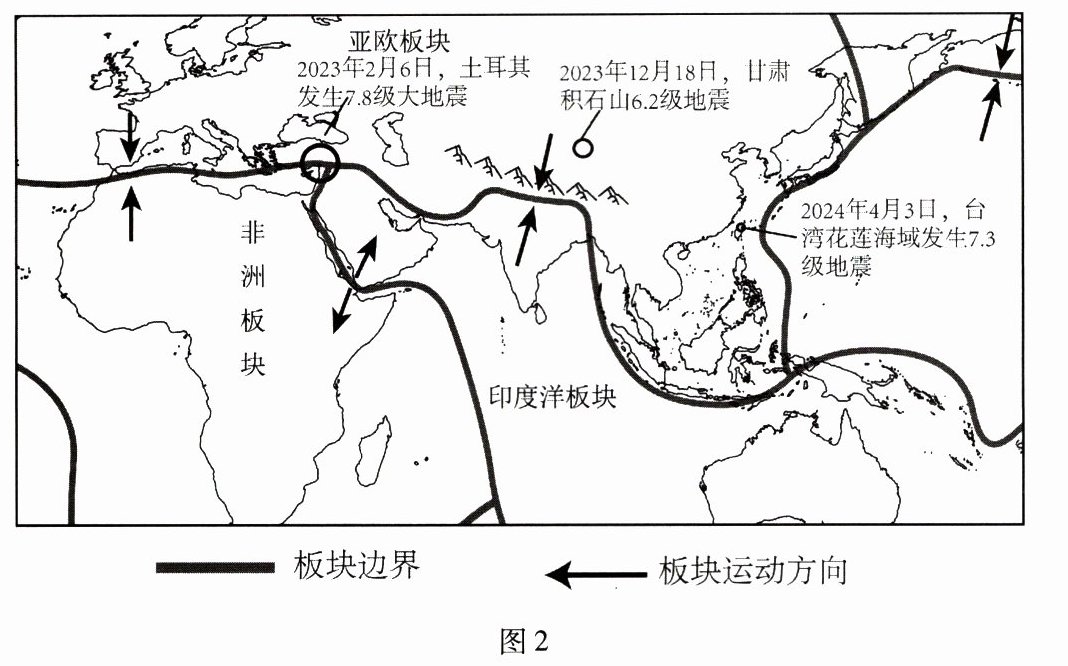 图 2 示意世界板块局部及三次地震震中位置,图 3 示意某人收到手机地震预警信息。读图完成$4、5$题。