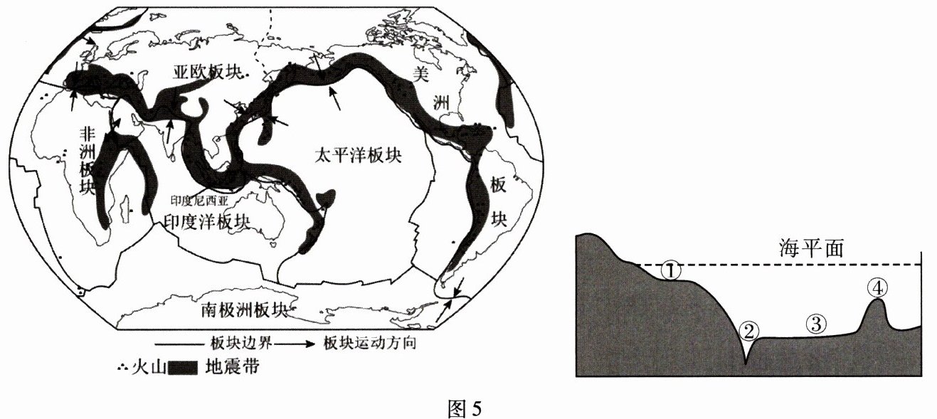 材料三 全球六大板块与主要火山、地震带分布图及海底地形示意图。