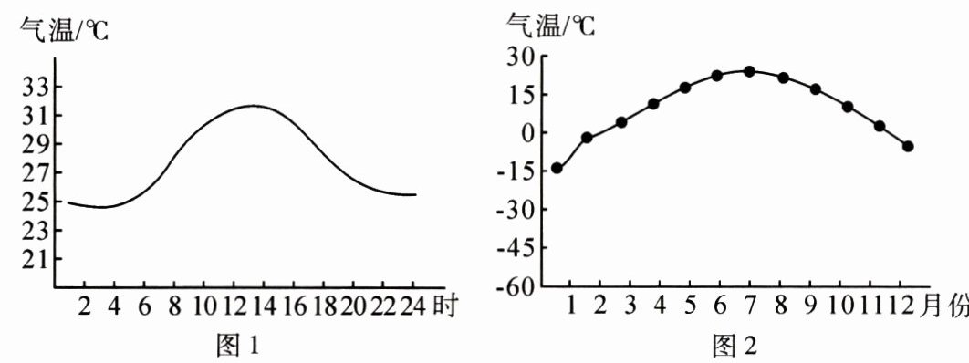 错误;图1中当天的最高温大概为32℃,最低温大概为24℃,因此气温日较差约为