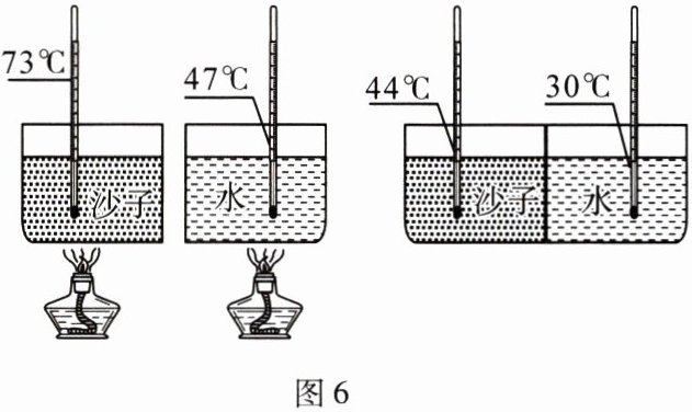 步骤2:用酒精灯给两烧杯加热5分钟后,移除酒精灯测量此时沙子与水的温度并记