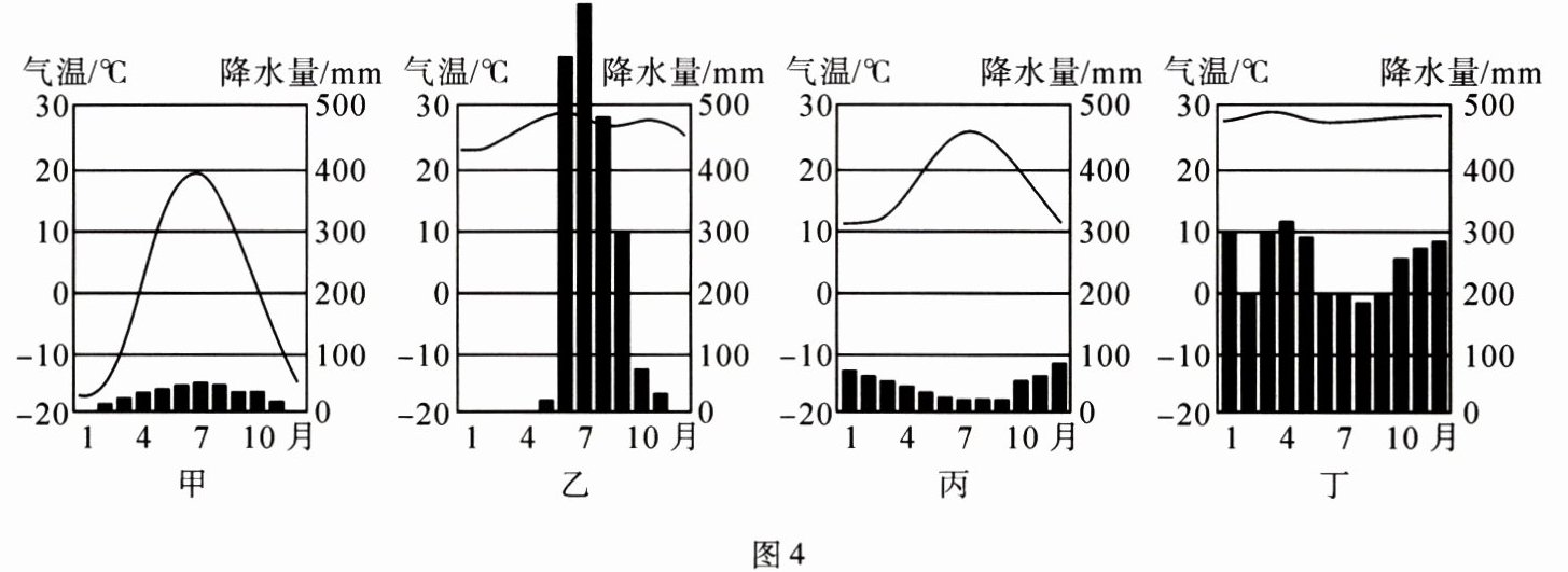 (1)乙 丁 (2)丙 (3)气温 降水 (4)ABC