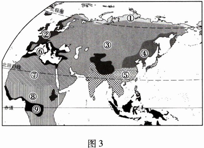1. 读世界部分气候类型分布示意图(图3),回答下列问题。