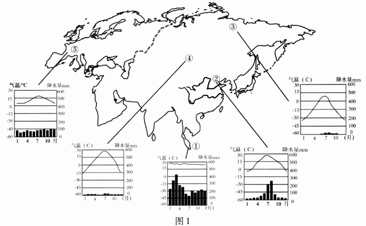 例:读亚欧部分地区气温曲线及降水量柱状图,完成下面1、2题。
