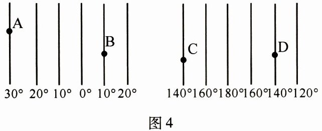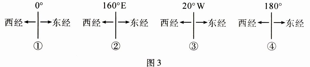2. 上图四个地点所在经线两侧东经和西经的标注,正确的是( )