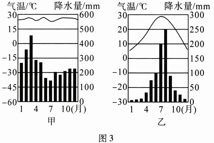 读甲、乙两地气温曲线和降水量柱状图(图3),完成1~3题。