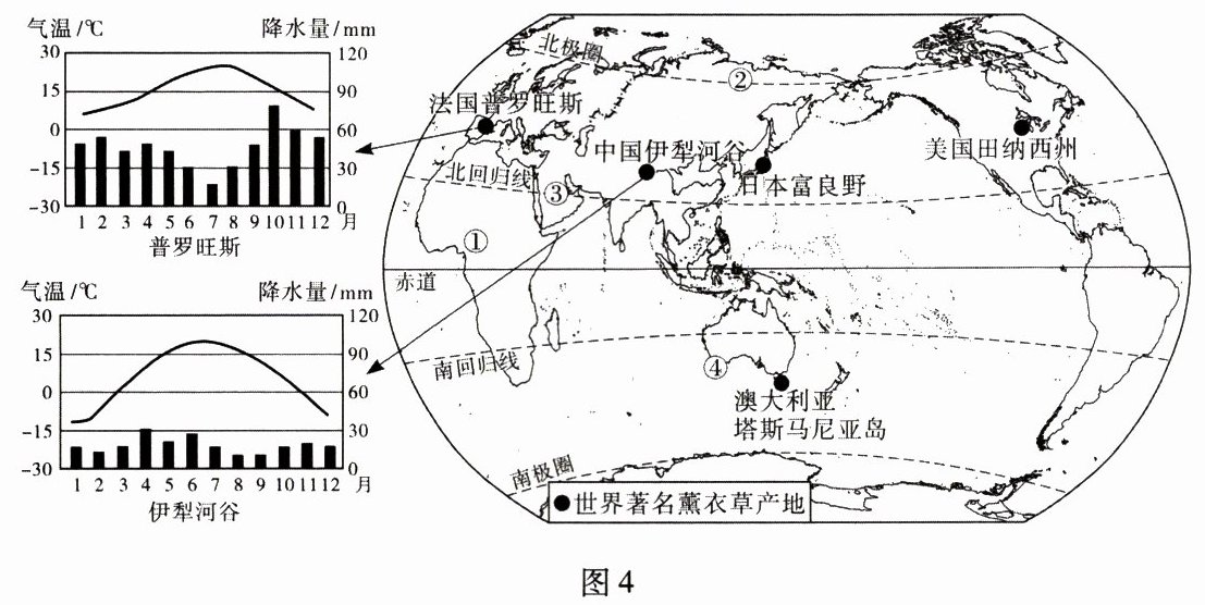 薰衣草喜光、喜干燥,对气温的适应性很强,花期在夏季,集芳香、观赏、保健、医疗等价值于一身。普罗旺斯是薰衣草的原产地,伊犁河谷被誉为“中国薰衣草之乡”。图4为世界著名薰衣草产地分布图和普罗旺斯、伊犁河谷气候资料图。据此完成下面4、5题。